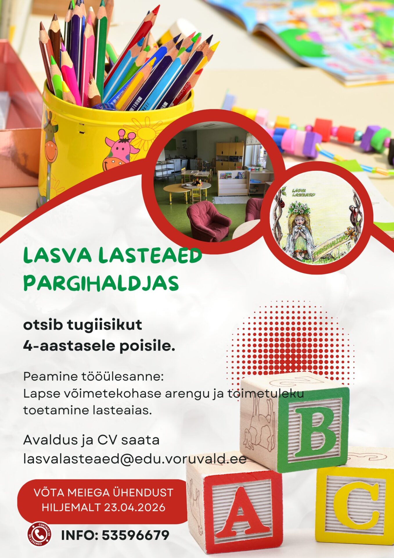Lasva Lasteaed Pargihaldjas otsib tugiisikut 4a poisile. Avaldus ja CV saata hiljemalt 23.04.2026 lasvalasteaed@edu.voruvald.ee. info 53596679